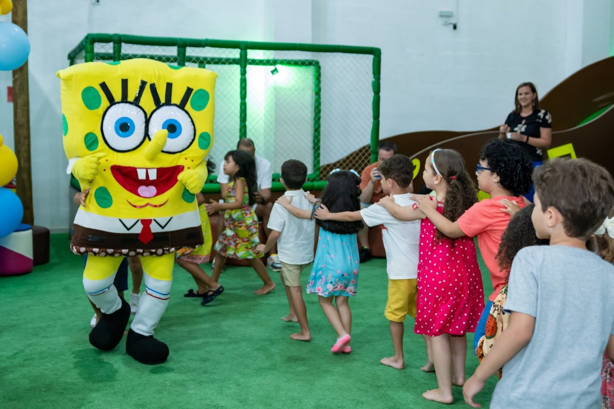 O tema escolhido foi o Bob Esponja, e a decoração colorida, com um mar de balões azuis e amarelos, transformou o local em um verdadeiro cenário de aventura.
